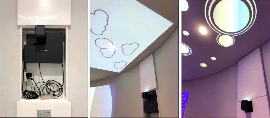 盡管地下室空間很大,但是弧形墻壁和繁多柱子的復雜結構,讓打造完整畫面難上加難,投影距離非常受限,投影機需要安裝在狹窄空間,負責影像方案的OCUBO公司選擇了富士膠片FP-Z5000,它具有的超短焦、大范圍鏡頭位移、0角度平行投射等特點提供了完美解決方案,并且只需要旋轉鏡頭即可改變投影方向,實現天花板、地面、墻面投影畫面全覆蓋。不僅勝任狹窄空間,還減少了預期使用臺數,降低成本。